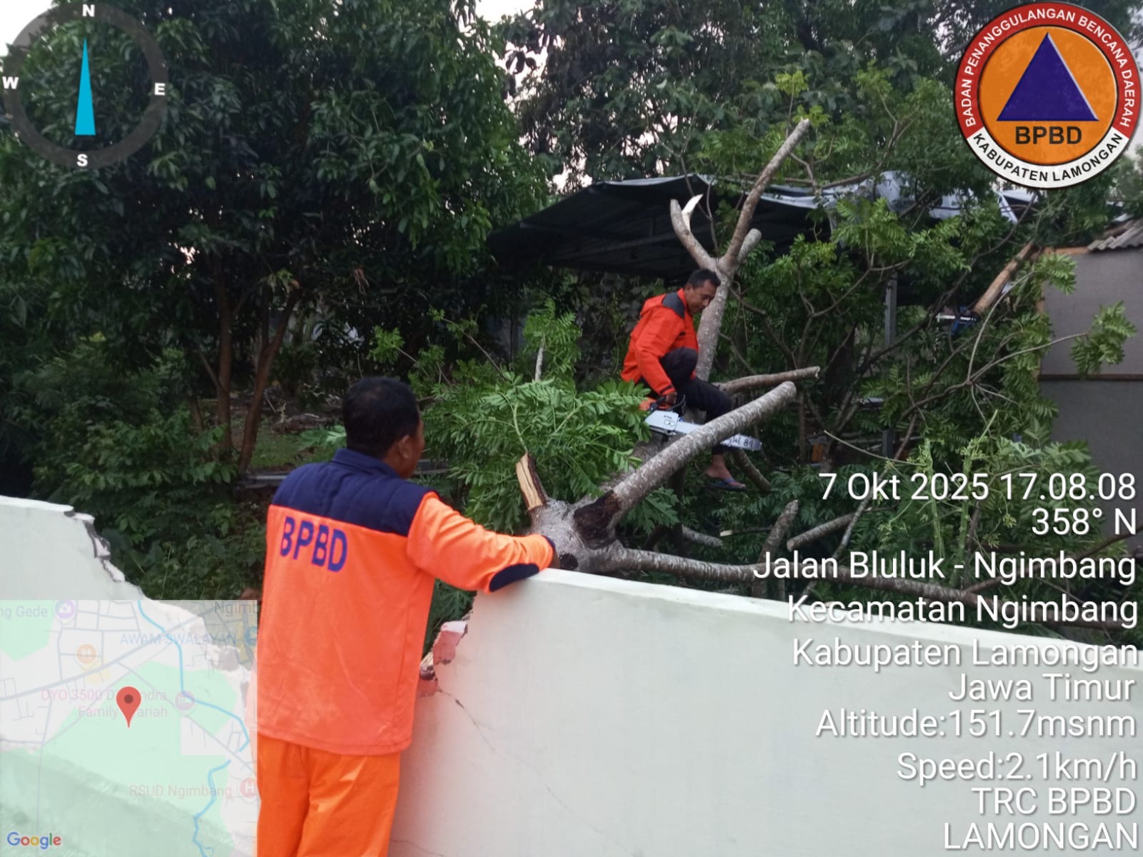 Lamongan – Hujan deras disertai angin kencang melanda beberapa wilayah di Kabupaten Lamongan pada Selasa, 07 Oktober 2025, sekitar pukul 15.00 WIB. Kejadian tersebut mengakibatkan pohon tumbang, kerusakan rumah warga, dan gangguan pada fasilitas umum di wilayah Kecamatan Ngimbang dan Kecamatan Sambeng.